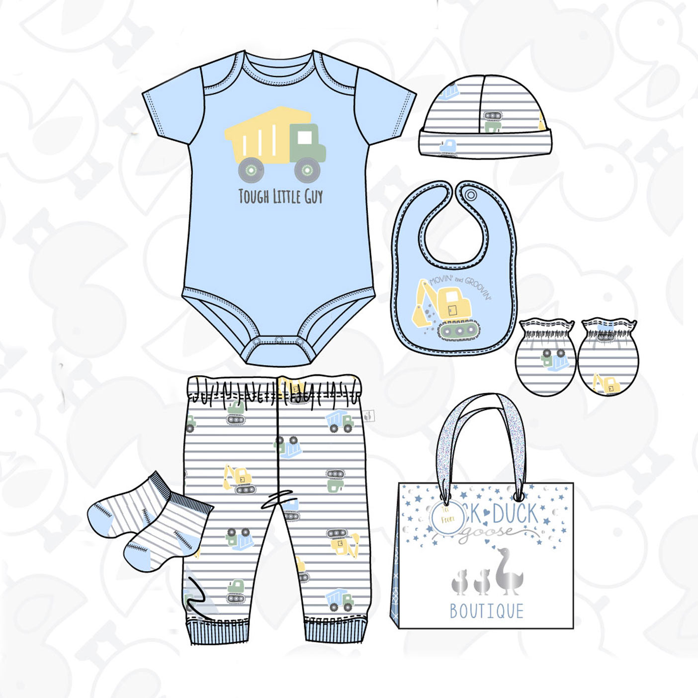 Hat, Bib, Socks, Mitts, Bandana Bib, Pants, Vest includes a gift bag.