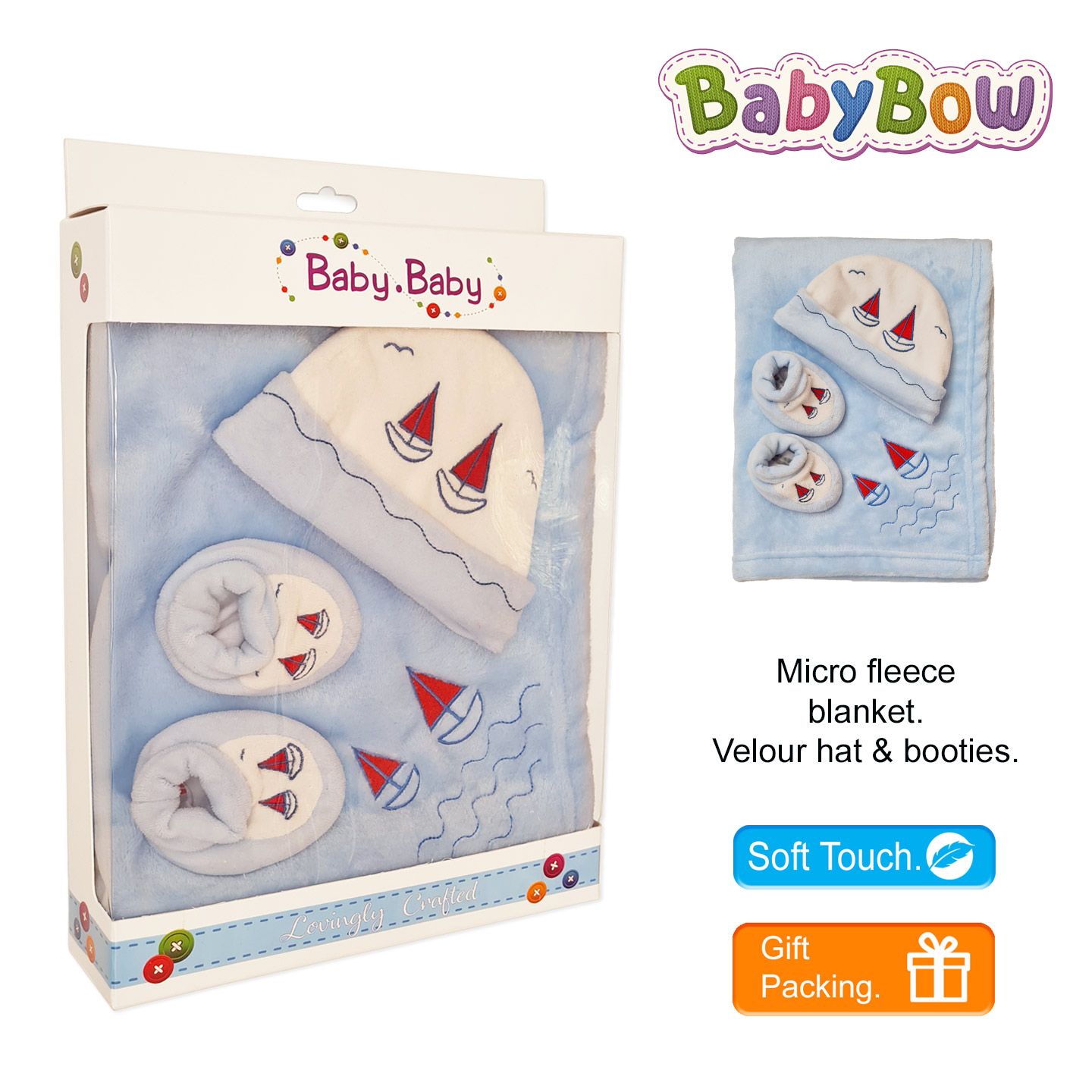 Blanket, Hat & Bootie set , comes with flower/boat embroidery. Presented in a strong gloss gift box.