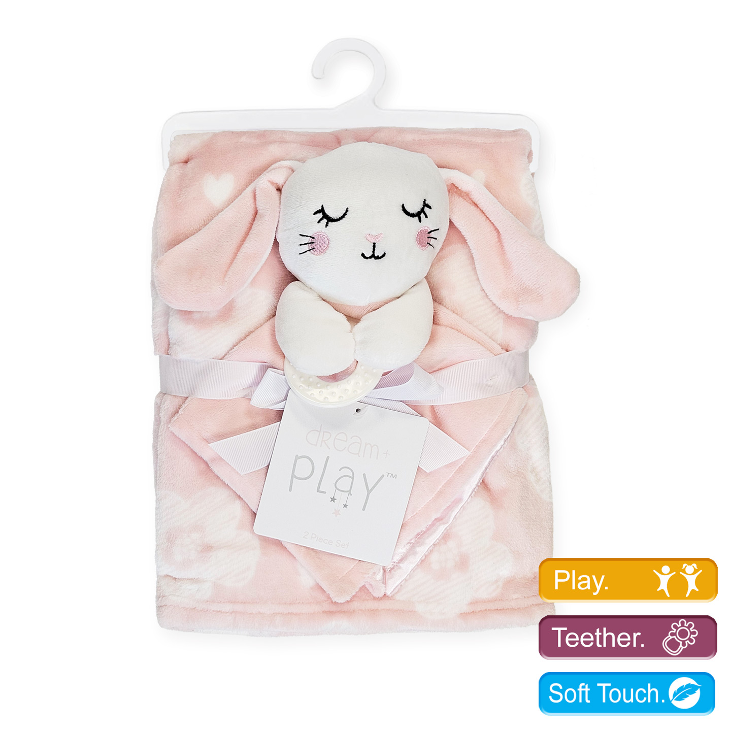 Bunny blanket & comforter set, long droopy ears, velour top and satin backed comforter, comes on a hanger.