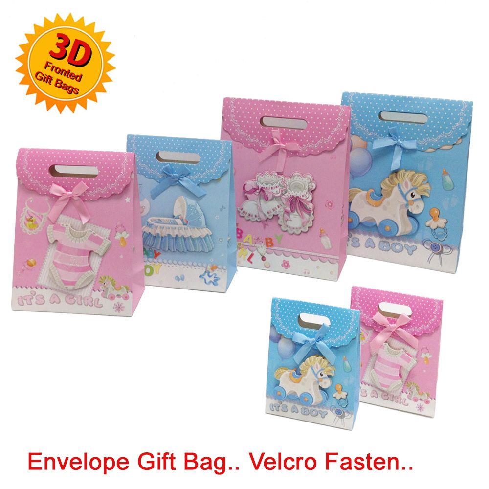 Small envelope baby gift bag with 3D effect motif on front of bag. Available in Pink & Blue. Sold in packs of 24.
