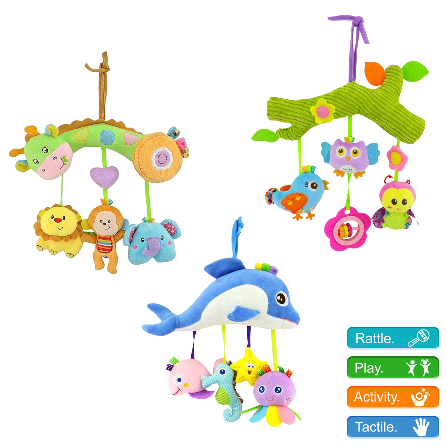 Hanging cot toy comes in 3 different styles Giraffe, Dolphin, Branch with animals. Includes a mirror toy and internal rattlers.