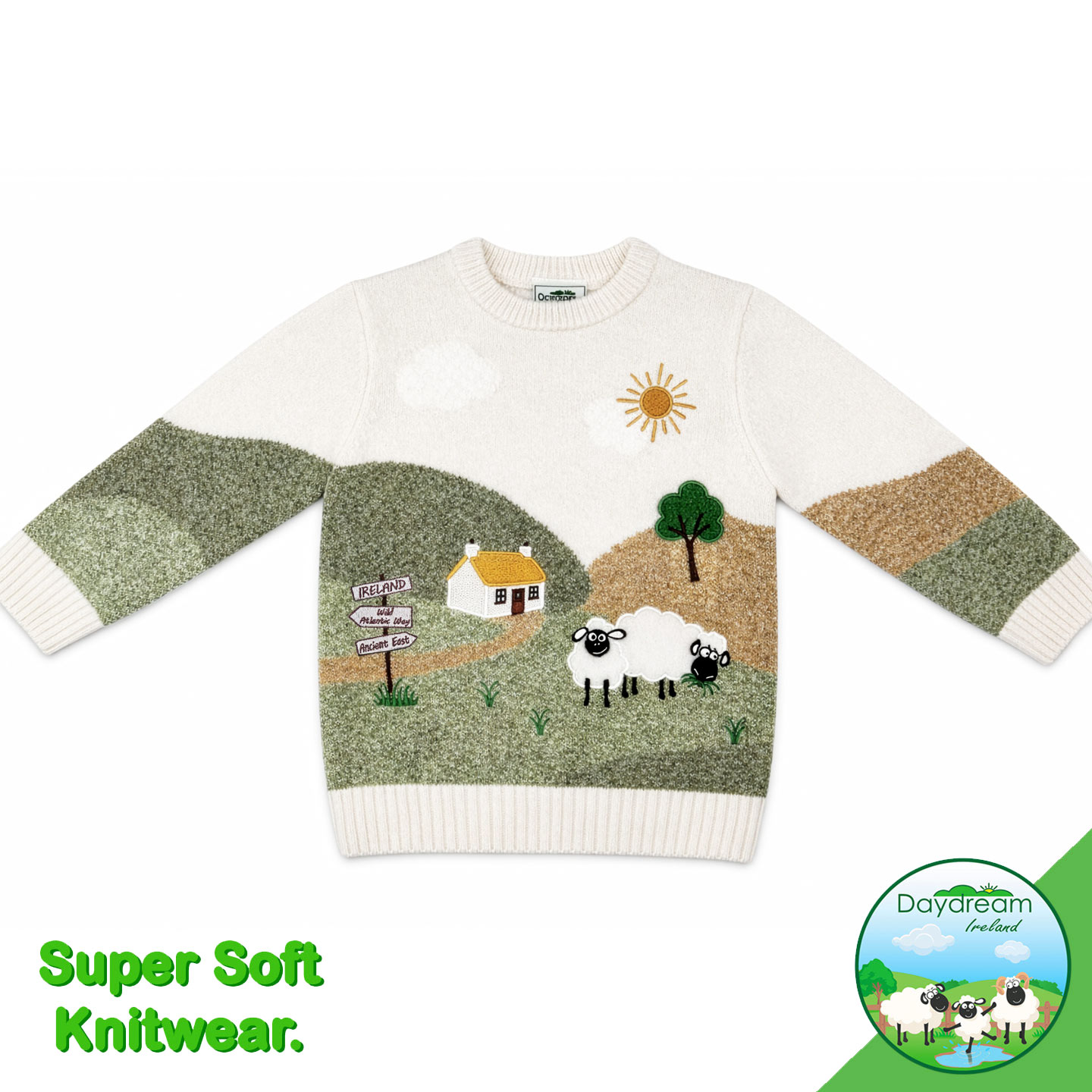 Playful kid’s jumper with scenic view of the Irish countryside and sheep. Nice embroidery detail.