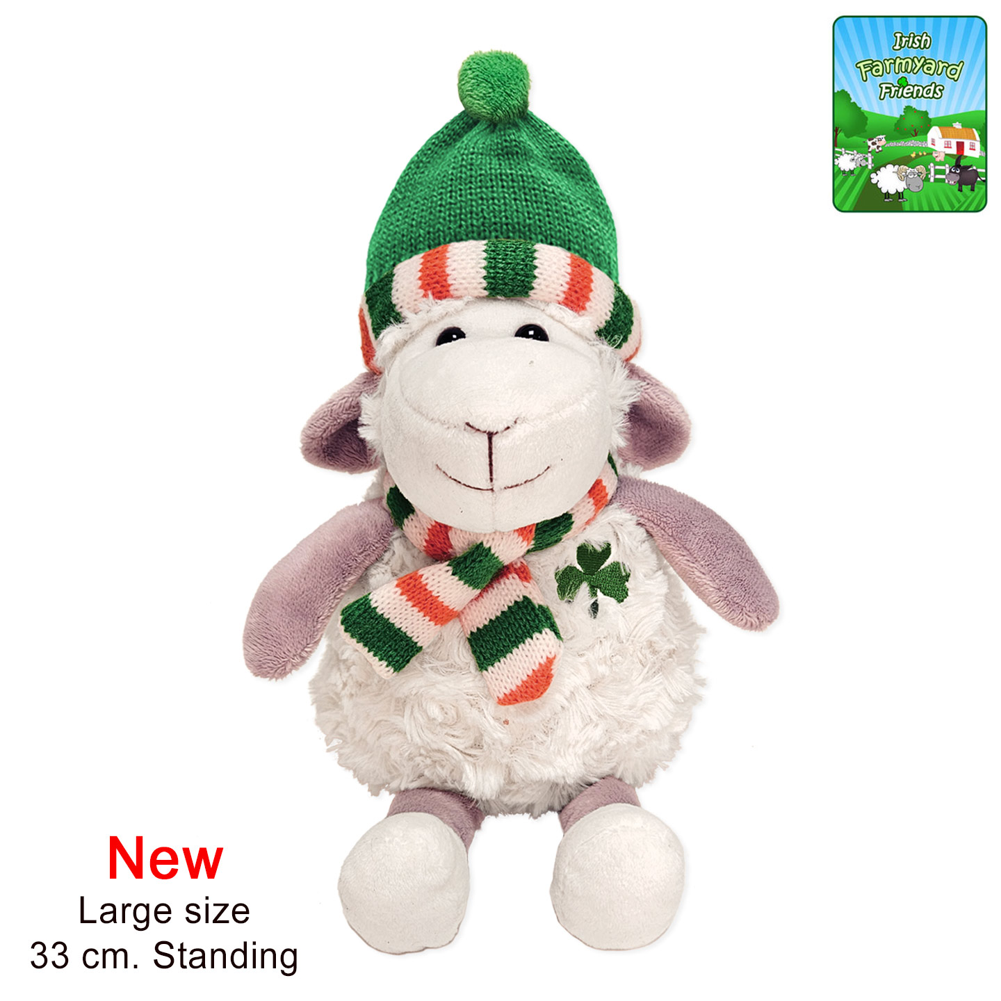 Comes with Irish flag colour knitted scarf & hat, stitched shamrock on the chest, dangly legs and soft fur.