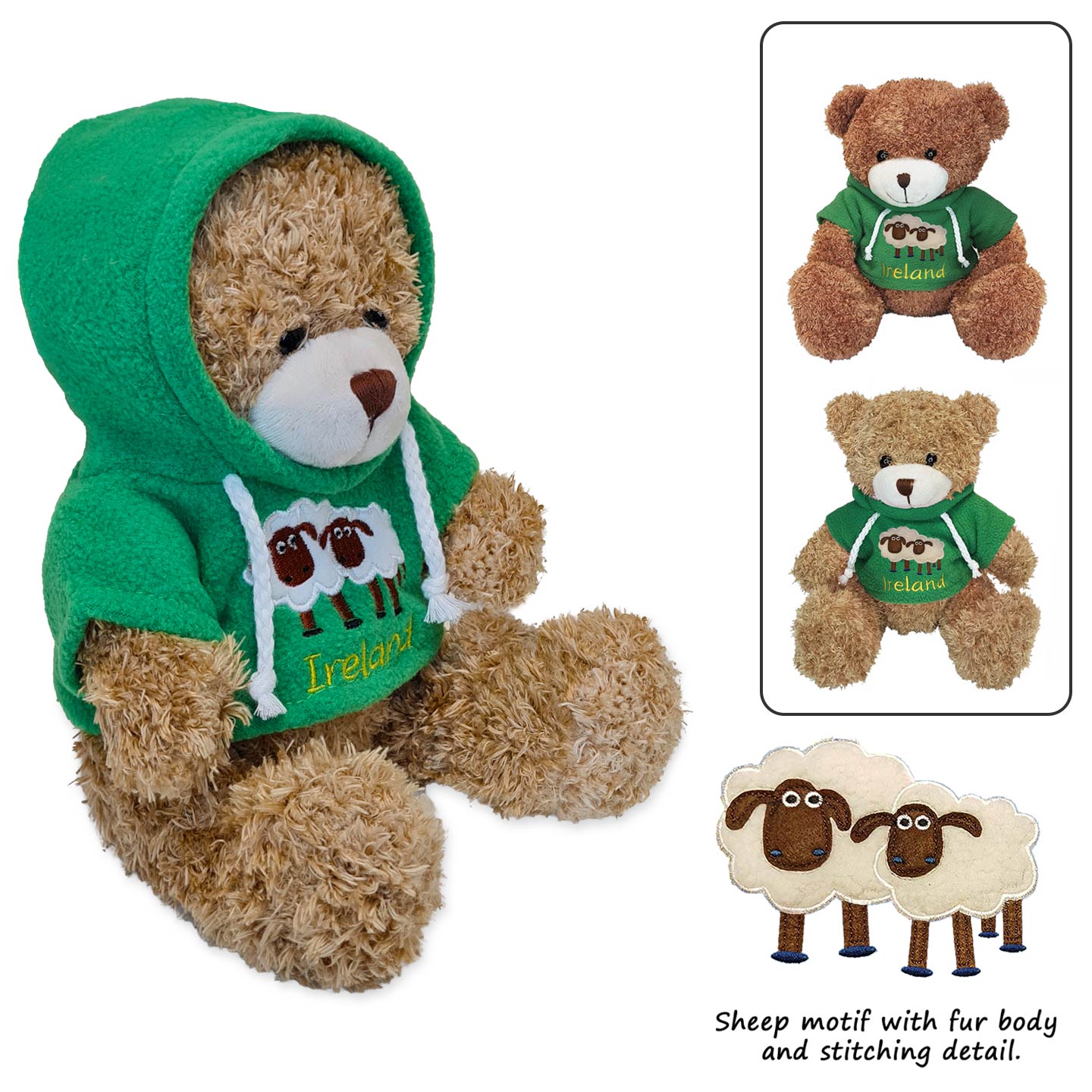 Introducing our Medium Plush Teddy in an Ireland Hoodie—a cuddly addition to your collection. These adorable bears, each 20cm sitting, come dressed in a green Ireland Hoodie and are available in four different shades of fur.