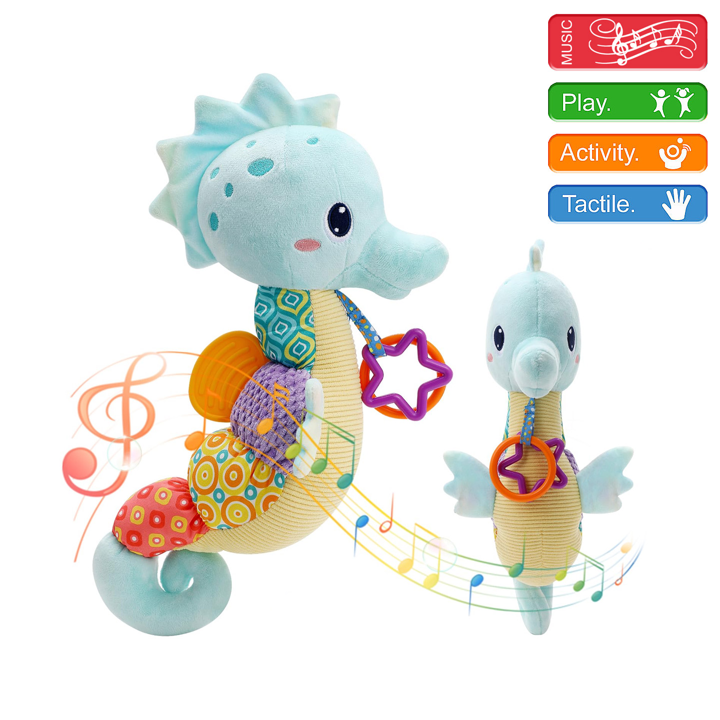 Seahorse toy comes with teether rings, crinkle material, squeak toy/ rattler inside and music.