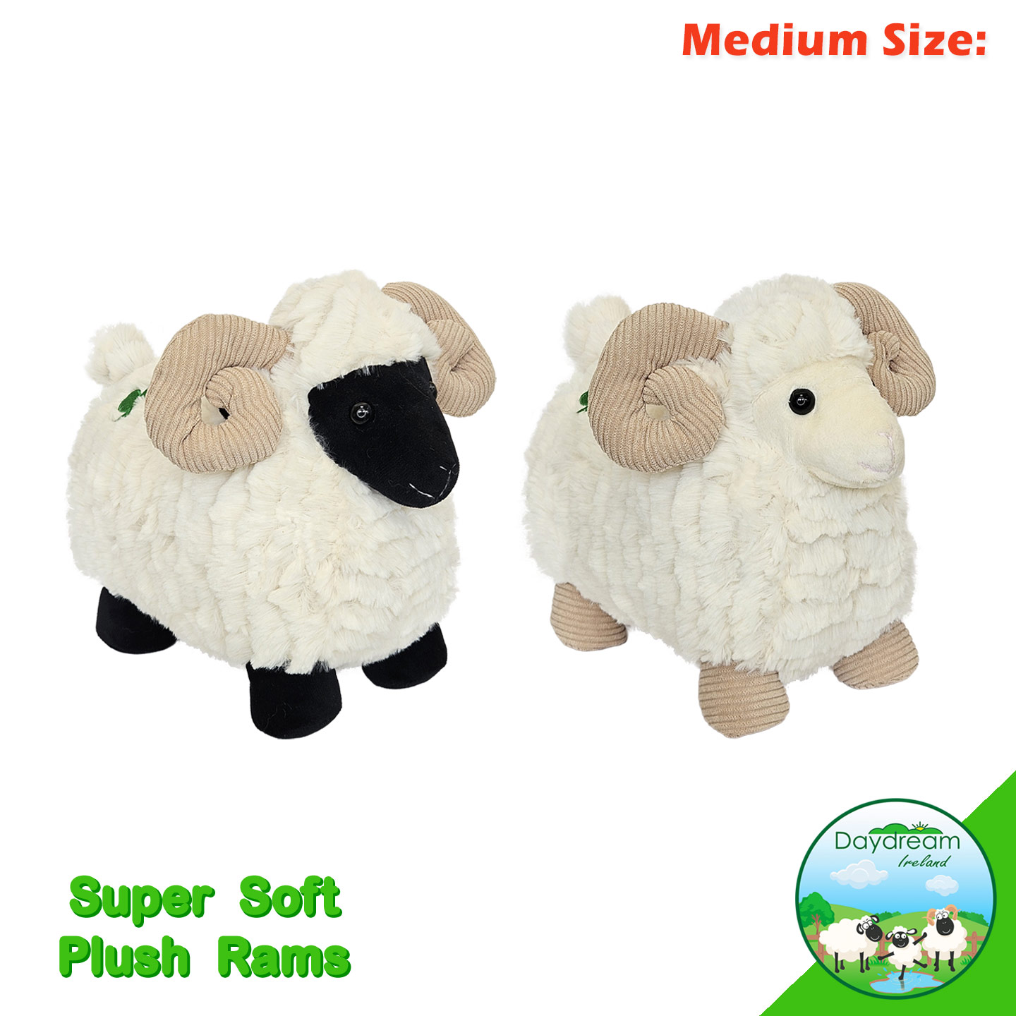 Plush super soft fur standing Ram. Comes with corduroy horns and feet, with a shamrock motif on the side.