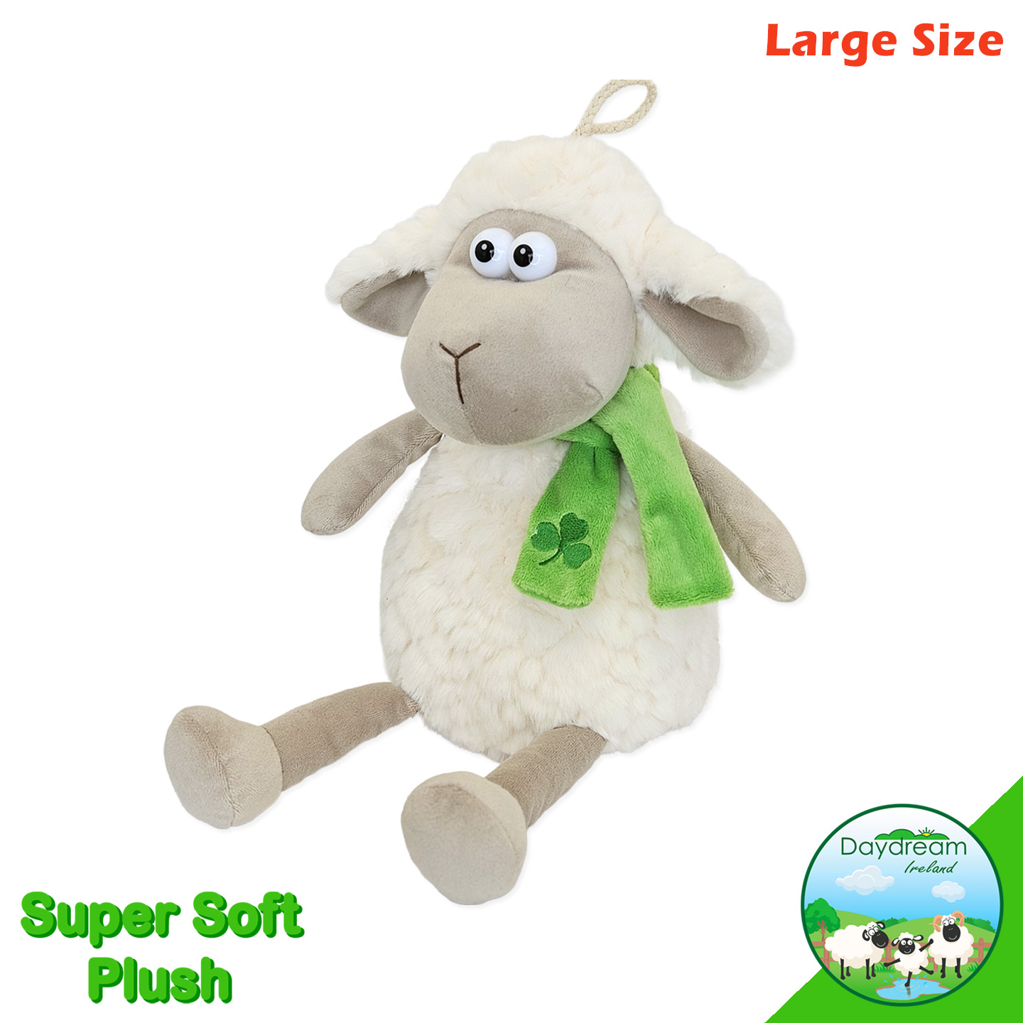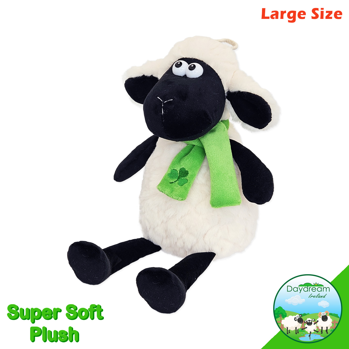 Comes in super soft fur fabric, green velour scarf with a shamrock motif. With dangly legs.