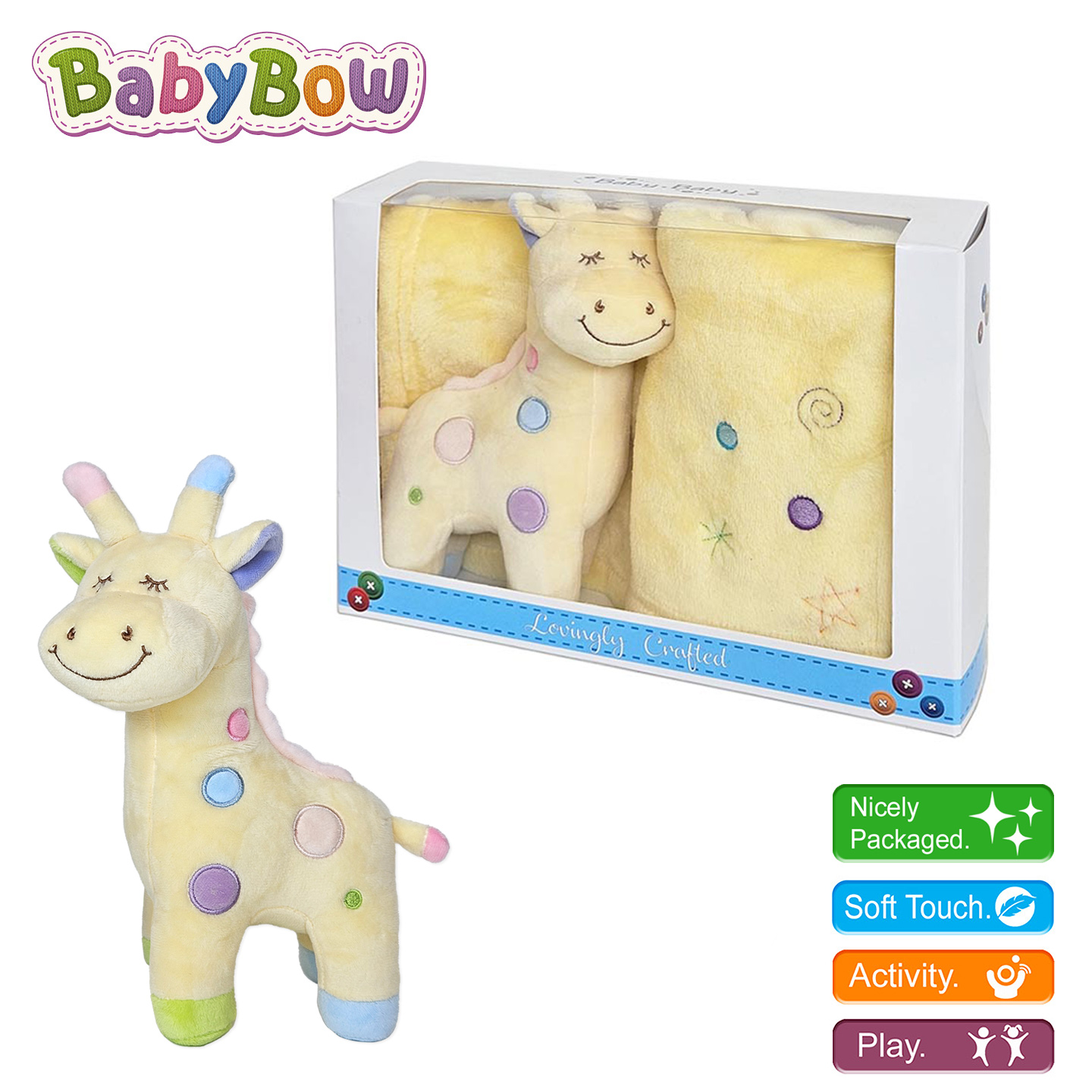 Ultra soft cuddly plush Giraffe with soft yellow blanket.