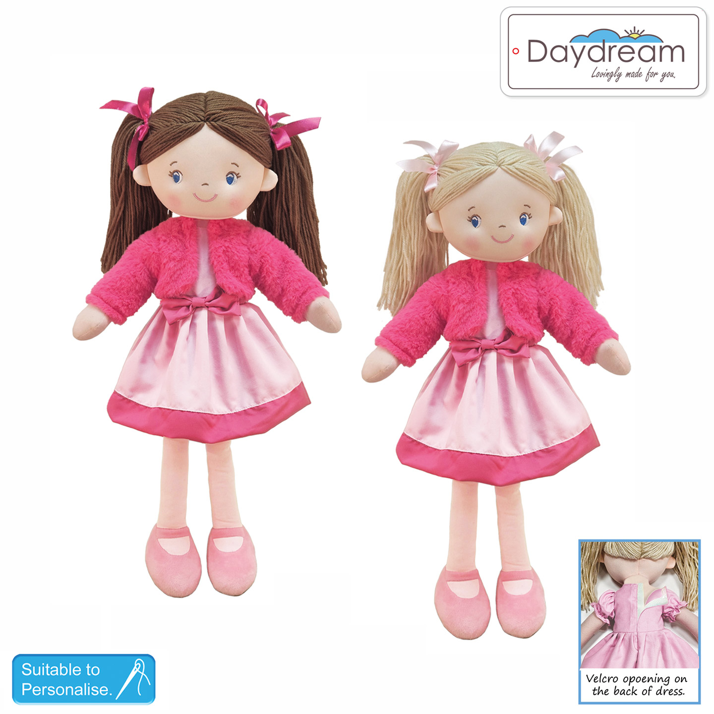 She comes in a Pink dress with a Velcro opening at the back, The jacket can also be easily removed, Ideal for personalising.